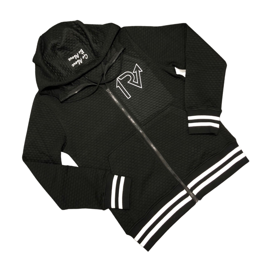 Constructed using honeycomb-quilted fabric (with larger octagons surrounded by smaller hexagons), this zip-up jacket features long sleeves, hoodie with drawstring closure, slanted pockets, and striped ribbed hem on the cuffs and bottom.